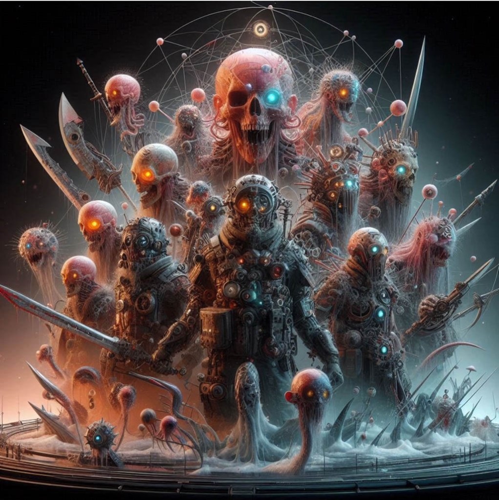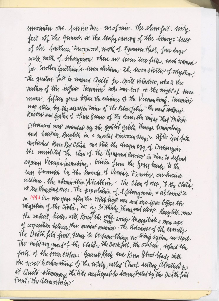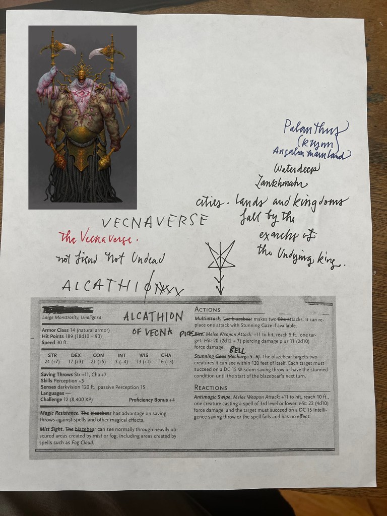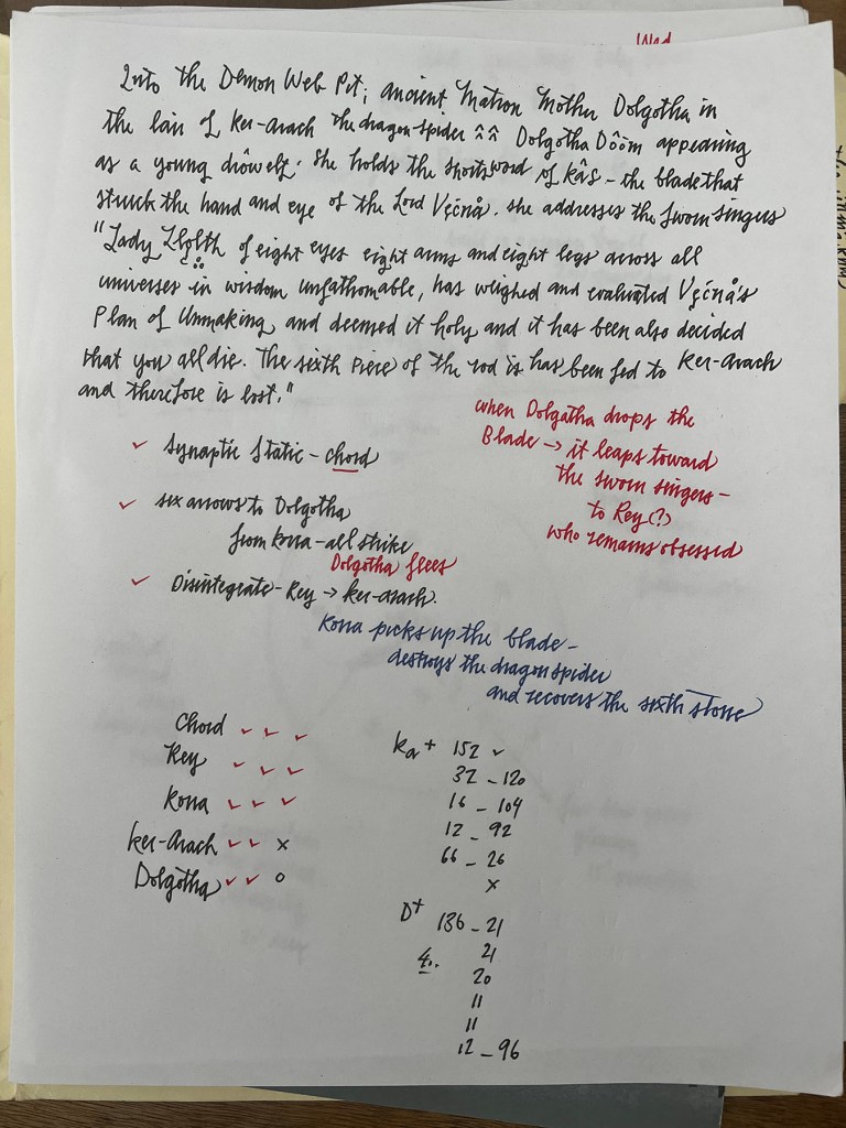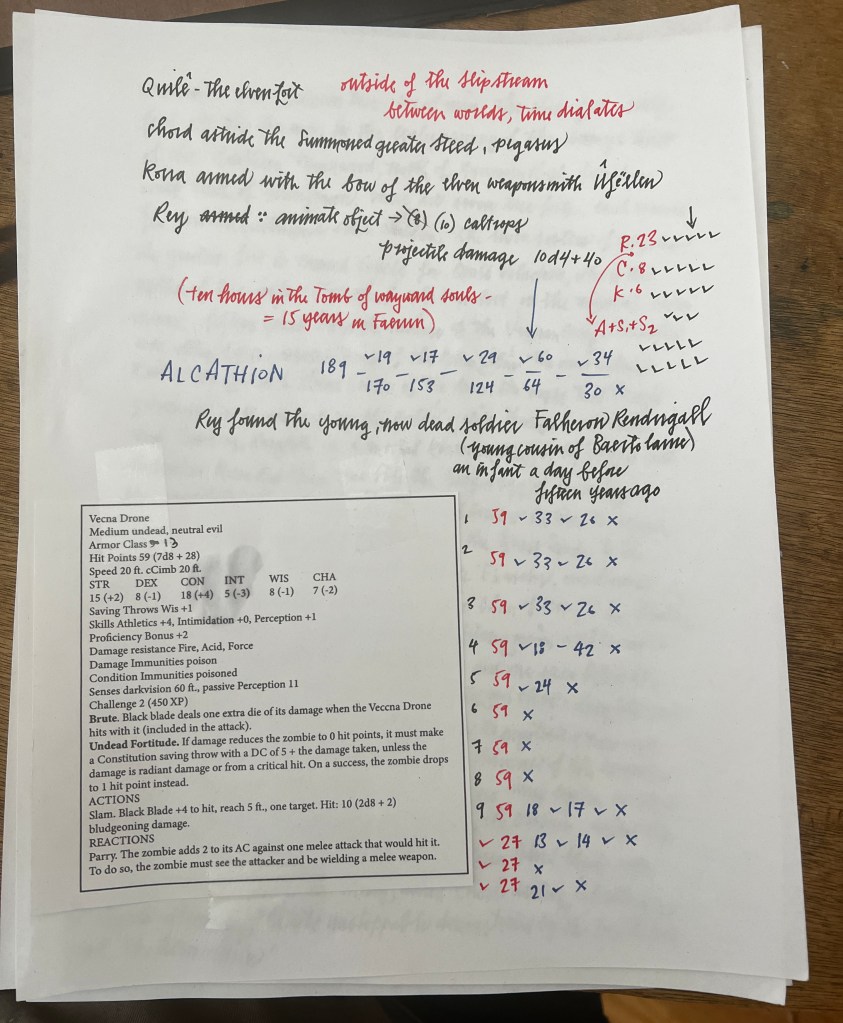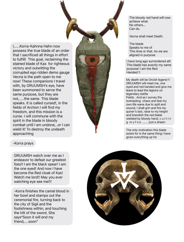 An unknown number of Exarchs march across different versions of UrUnon, preparing the world for the Unmaking of Vecna. Many souls exist in multiple planar contexts simultaneously. Reality fractions greatly as the threads of all fray, preparing the undead world to come. Riding a wave designed by the Dukes of Aaqa who foretold such an event five thousand years before, at the time of the Rending, when the death of the Dragongod Tiamat heralded a similar cataclysm, the Sworn Singers advance towards an unknown goal. It may be that the location of Vecna, the undying god, is finally revealed when the Bling Singer, the Kodesh Hiyot, the entity known as Chord, assembled the seven gems, and the Singers will have to battle, now armed as Korra is, with the infamous Sword of Kas, or it may be that the Wizards Three have something else in mind that has yet to be revealed, some last, desperate plan. Whatever the final revelation, the mortal consciousness of Korra and Reaylith, so advanced and so warped to cope with and to understand the massive upgrades of experiential arcane power with which they are so imbued, mirrors itself across the psychic landscapes of the world. Meanwhile, Chord is a triangulated anchor, resistant to the normal restraints of the mortal mind, and because of the artificial constitution of the warforged bard, total war has been yet averted. Whatever pieces of the world survive this cosmos-level event will be forever altered as it seems that what the heroes represent now is to save the threads of what was before and to seed the future world with memories of what once was.