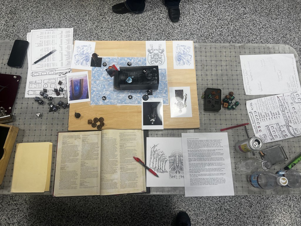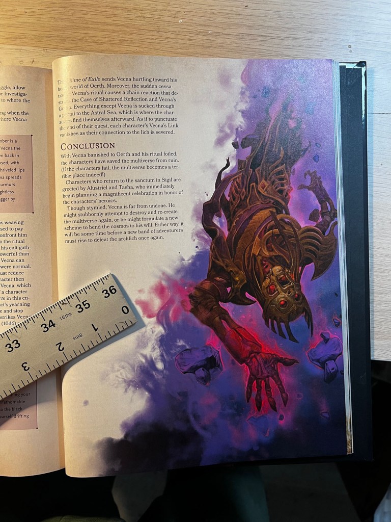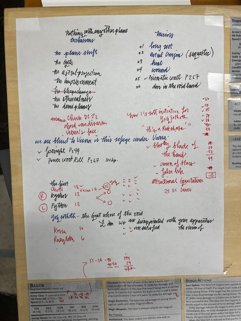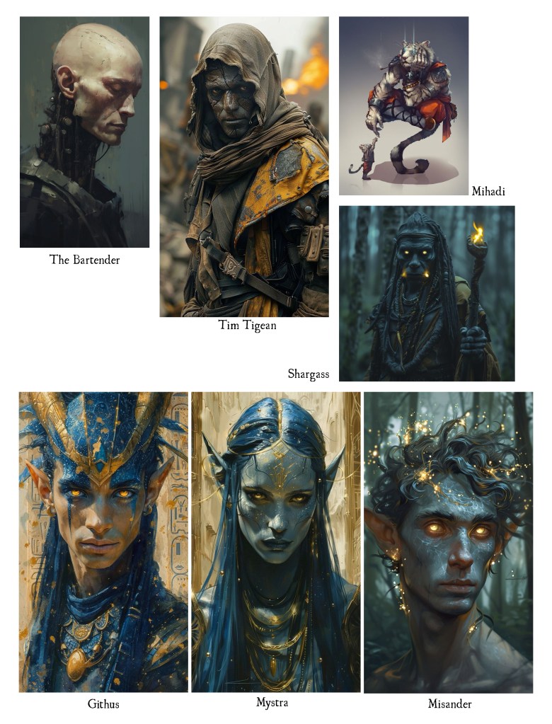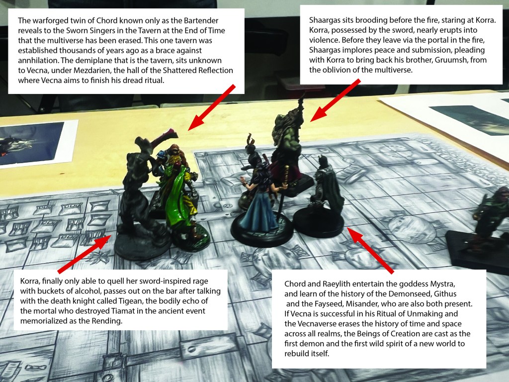 Under the Hurricane Tower, Mezdarien in the Domain of Dread, the long-held, last-ditch plan to combat the Vecnaverse against its final takeover of all existence: The Tavern at the End of the World. A Demiplane, crowded with emissaries who may need to reseed the world with life on a necroscape of the archlich’s design. Cast includes: Shargass, the orc deity of darkness; Mystra, the goddess of magic; Mahadi, the rakshas and his daughter; Misander, the archfey; Githus, the demonseed; Tim Tegean, the deathknight; the bartender, a warforged.