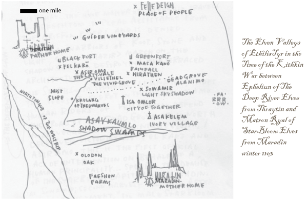 Maralin, ancient springs well up through trees that grow from ancient Khepathian ruins. The City of the Star Bloom elves had aligned with the People’s army of Gavin Wel in the Civil War that had ended with the opening of the Shadow Road. Thraytin and Maralin continue to war. Epheliun will have the death of Maralin.