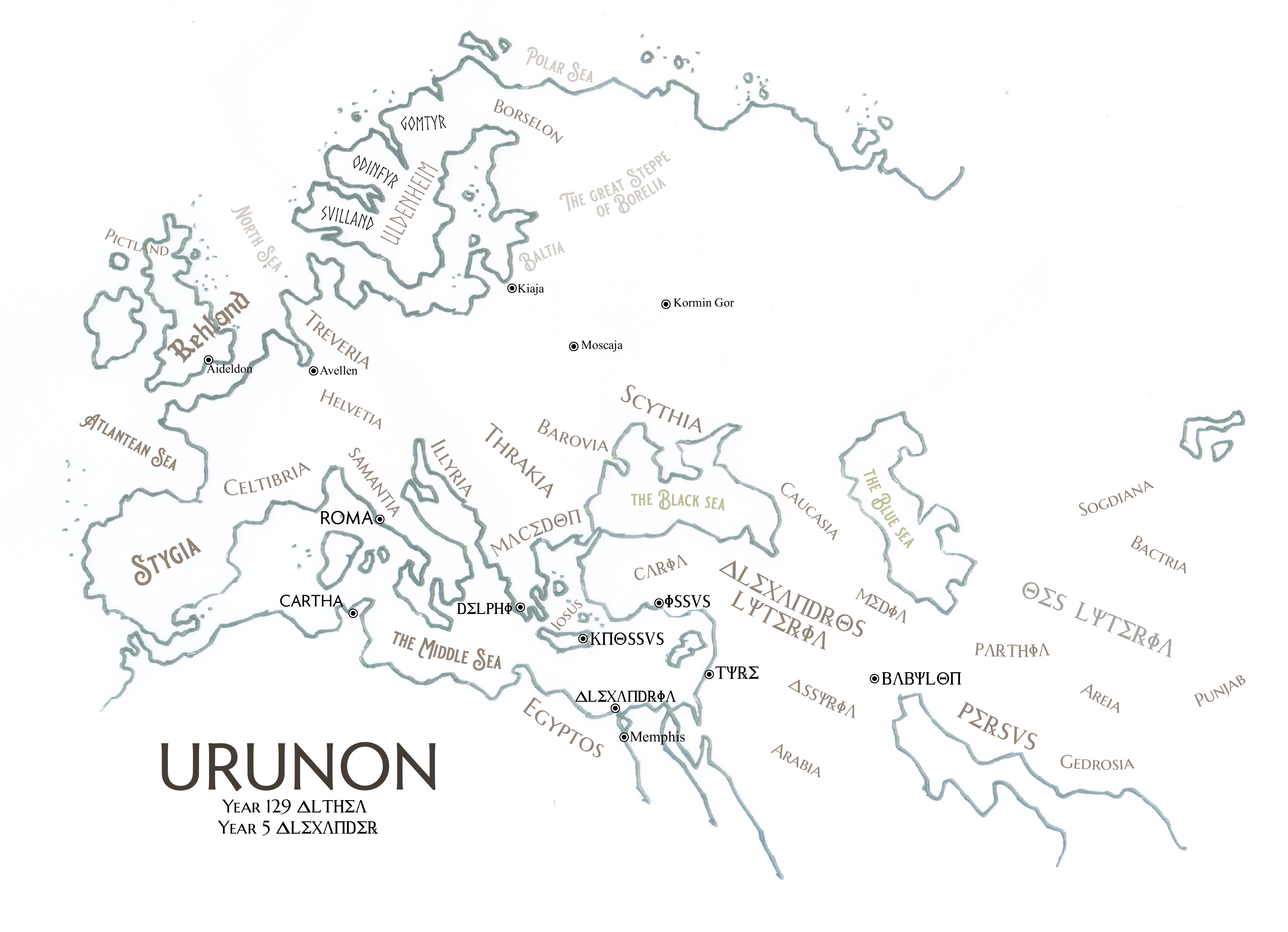 Urunon is a world full of many different campaign settings inside a quasi-historical approximation of ancient Europe in the fourth century B.C. The entire canon of Dungeons and Dragons exists within this mythic geography. Bookended by two major cultures: Uldenheim to the north, and Alexander‘s kingdom to the south and east, Urunon swings between high-fantasy, dark fantasy, and themes of Sword and Sorcery.